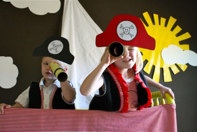 O que é uma festa pirata sem o capitão gancho? Adoramos a ideia de usar o capitão gancho como decoração nas mesas de festa. O navio pirata, o papagaio e a bandeira pirata também não poderiam faltar, é claro. E não seria uma festa pirata sem um baú do tesouro. Além de tudo isso, os próprios jovens piratas e um simpático ratinho.